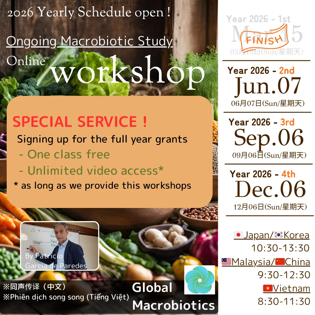 The ONGOING MACROBIOTIC STUDIES is part of our Global Macrobiotics effort to continuously provide and develop macrobiotic education. This ongoing online classes are conducted and taught by Patricio Garcia de Paredes and coordinated, translated and available locally in collaboration with our international network and partner schools in Japan, China, Malaysia and Vietnam. This ongoing study sessions is available to all of our students to help them proceed in their macrobiotic studies, to provide guidance and a platform for continuous discussion and learning that provides practical applications of macrobiotic principles in daily life with the goal of improving health and happiness. The only prerequisite to take this online classes is to have completed our Level 1 Course or a similar course containing the basics of macrobiotics. This ongoing online classes are particularly intended for those who have completed our Levels 2 and 3 courses and wish to continue their macrobiotic studies.